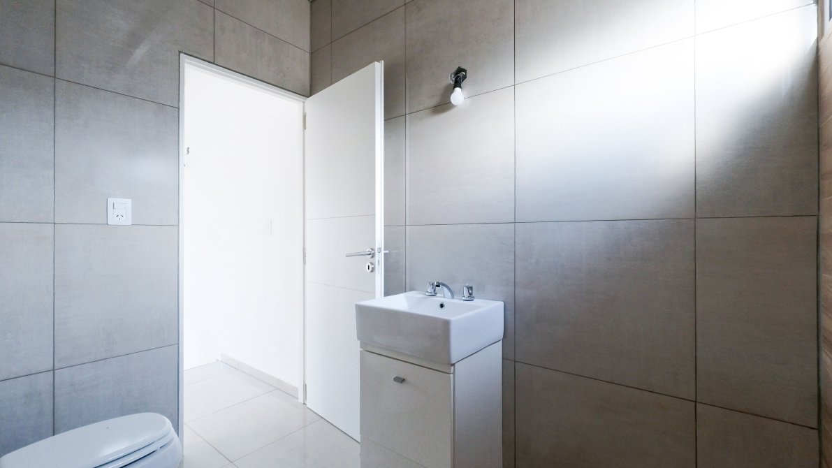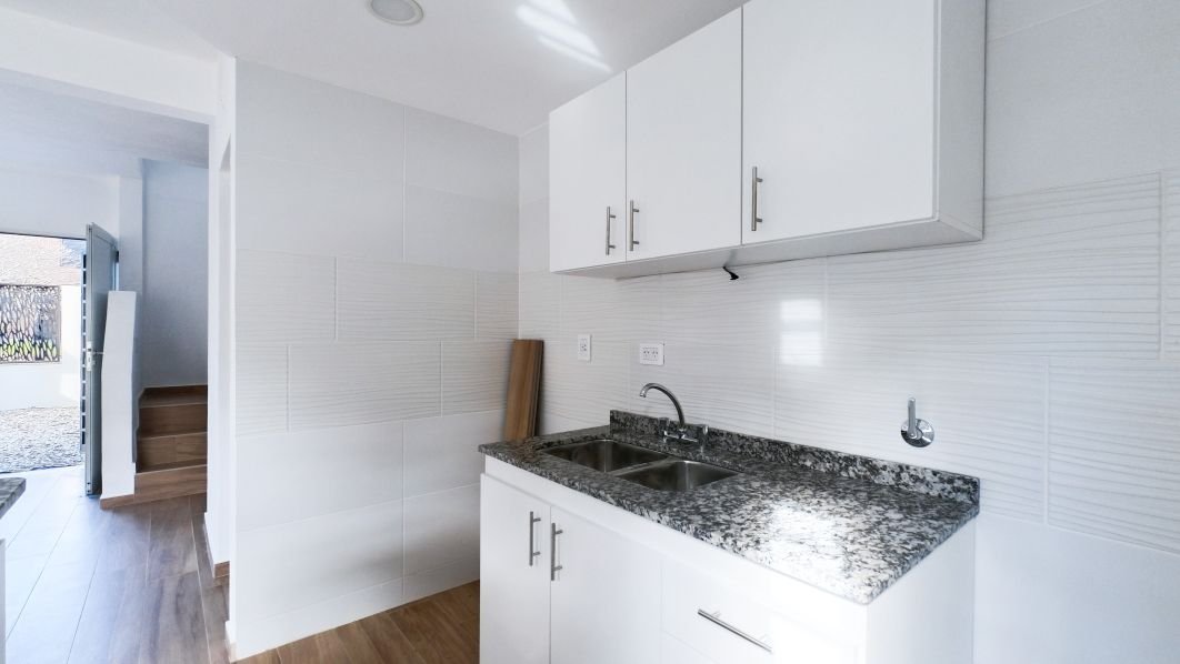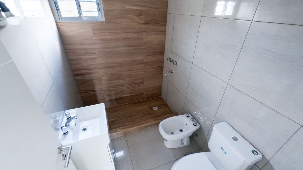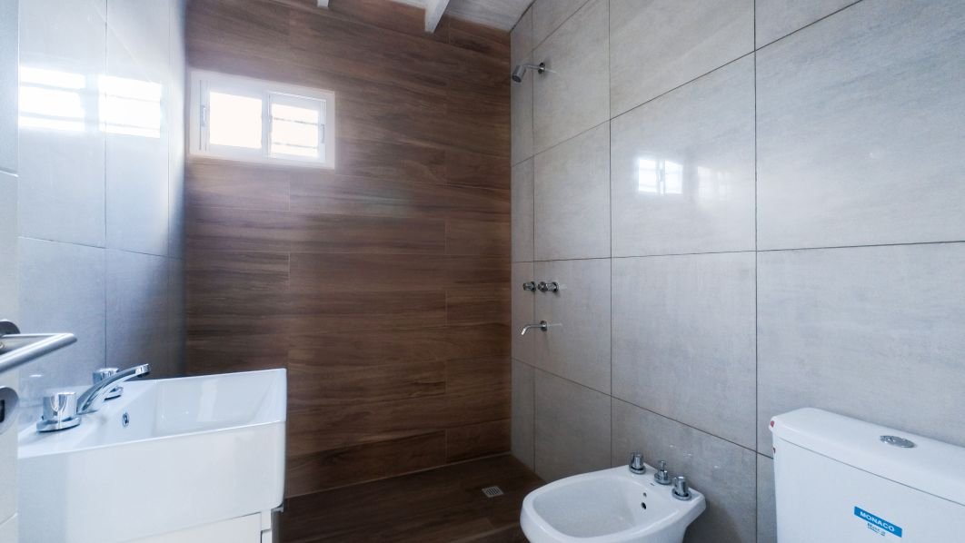 El dúplex se entrega equipado con una bomba centrífuga y un termotanque eléctrico. La cocina cuenta con una mesada de granito gris Mara de 1.20 metros, doble bacha, alacenas en blanco y un desayunador también en granito gris Mara. Los pisos y paredes de la cocina y los baños están revestidos en porcelanato, al igual que el exterior del dúplex, garantizando durabilidad y un aspecto impecable.